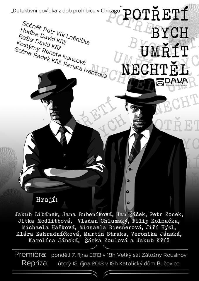 Divadelní a výtvarný ansámbl D.A.V.A po úspěšně oprášeném muzikálovém představení „Rousínovský Vodník“ (21. září 2013) představil nově nastudovanou činohru Petra Lněničky „Potřetí bych umřít nechtěl.“ Padesátiminutová jednoaktovka byla diváky přijata velice kladně, což dokládal nejen častý smích v průběhu představení, ale také nadšený potlesk při děkovačce. V premiérovém představení se v pondělí 7. října 2013 v 18h v sále Záložny představili Jan Žáček, Jana Bubeníková, Šárka Zoulová, Klára Zahradníčková, Jitka Modlitbová, Michaela Riesnerová, Michaela Hašková, Veronika Jánská, Karolína Jánská, Jiří Hýzl, Vladan Chlumský, Filip Kolmačka, Martin Straka, Jiří Kamenský j.h. a Jakub Kříž j.h. V hlavní roli se představil Jakub Libánek, který opět nenechal publikum na pochybách, že je na jevišti jako ryba ve vodě. Premiéra se uskutečnila v kostýmech Renaty Ivancové a scéně Radka Kříže. Režisérem a autorem hudby je umělecký vedoucí souboru David Kříž. D.A.V.Áci tak navázali na loňský bohatý divadelní podzim. Činohru „Potřetí bych umřít nechtěl“ zahrají ještě jednou v Rousínově (sobota 12. října 2013 v 18h) a na divadelním festivalu v Bučovicích (úterý 15. října 2013). V měsíci prosinci potom soubor představí nový koncertní projekt „Vánoční koncertní zamyšlení“. Více informací o souboru naleznete na www.davarousinov.cz . D.A.V.A